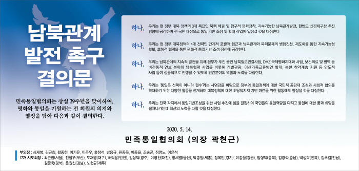 민통은 이날 서울 프레스센터에서 열린 창설 39주년 기념식에서 회원 일동의 결의문을 통해 “남북관계의 지속적 발전을 위해 정부가 추진 중인 남북철도연결사업, DMZ 국제평화지대화 사업, 보건의료 및 방역 등 남북협력 사업을 적극 촉구한다”고 밝혔다.