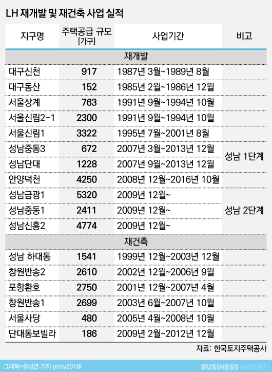 특히 사업성이 낮아 민간이 기피하거나 주체 간 갈등으로 장기간 방치됐던 재건축 사업도 1999년 성남 하대원을 시작으로 지금까지 6개 지구를 개발해 1만266가구를 공급한 바 있다.