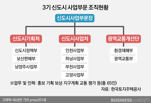 LH는 지난 1월 3기 신도시 조성을 위한 전담조직인 신도시사업부문을 신설, 본격적인 개발 사업에 나섰다. 총 65명의 인력으로 구성됐으며 3기 신도시 보상 착수와 공사 착공 등 사업 추진 상황에 따라 탄력적으로 인력과 조직을 운영할 계획이다.