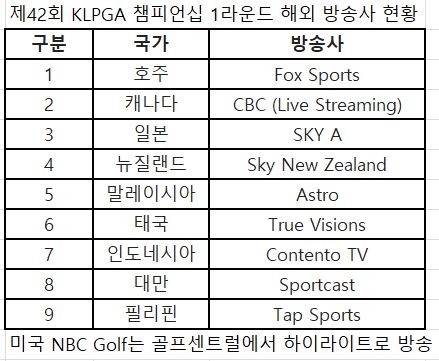 14일 경기도 양주 레이크우드컨트리클럽(파72 6540야드)에서 열린 한국여자프로골프(KLPGA)투어 제 42회 KLPGA챔피언십(총상금 30억원) 첫 라운드가 호주, 캐나다, 일본, 태국 등 9개국에 3시간 중계됐다. 미국 NBC골프는 골프센트럴에서 하이라이트로 방송됐다.