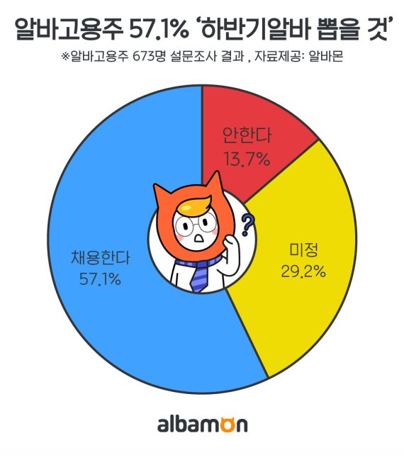 아르바이트 대표포털 알바몬이 최근 알바 고용주 673명에게 ‘하반기 아르바이트생 채용계획’을 주제로 설문조사를 실시한 결과 이같이 나타났다고 20일 밝혔다.