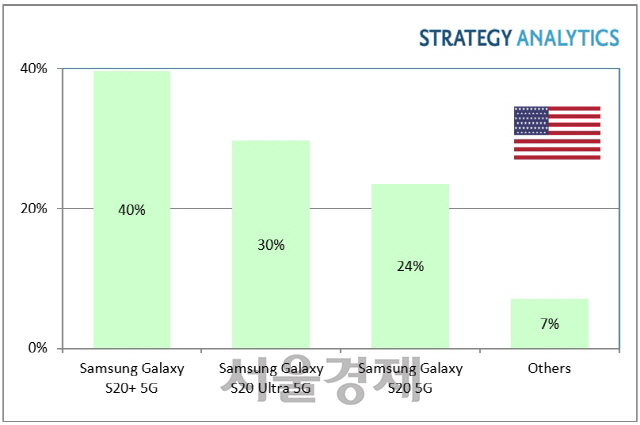 갤럭시 S20플러스는 40%의 점유율로 미국 1·4분기 5G폰 판매량 1위를 차지했다.