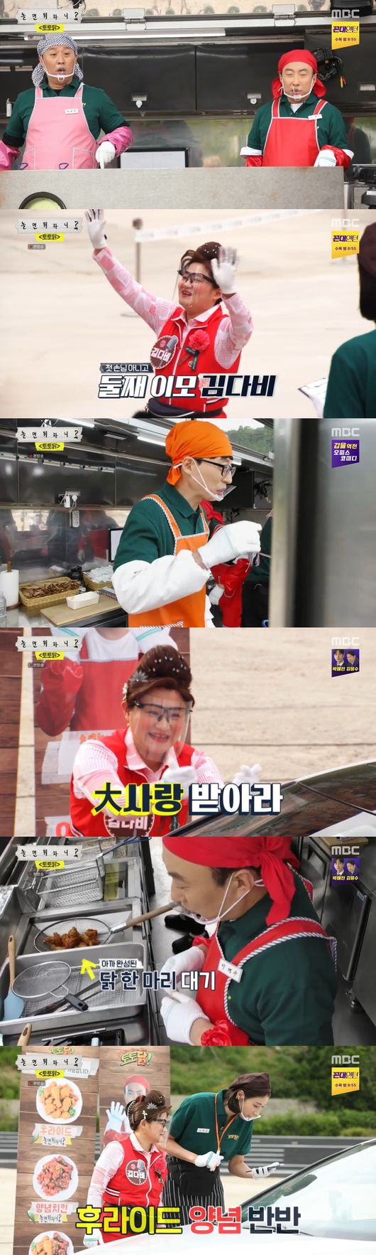 '놀면 뭐하니' 멤버들은 갑작스런 주문 폭주에 결국 '양념 반 후라이드 반' 메뉴를 삭제했다. 박명수는 "허리 나간다"며 고충을 털어놨고, 김신영의 둘째이모 김다비가 계속해서 재촉하자 '현실남매' 호흡을 과시했다. 뿐만 아니라 김신영의 둘째이모 김다비는 오래 기다리는 손님들을 위해 '주라주라' 깜짝 공연을 펼쳤다. 손님들은 와이퍼를 움직이거나 비상등을 키면서 공연을 함께 즐겼다.