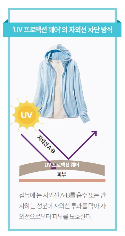최근 의류업계에선 자외선 차단 기능을 강화한 기능성 의류를 앞다퉈 개발·출시하고 있다. 대표적으로 유니클로의 ‘UV 프로텍션 웨어(UV Protection Wear)’는 아우터·카디건·모자 등 제품군에 따라 UPF 15부터 50+까지 자외선 차단 기능을 갖췄다. 40여 종류의 아이템이 자외선을 반사 또는 흡수해 자외선 A·B를 90% 이상 차단한다. 성인용뿐 아니라 베이비용(키 80~100㎝), 키즈용(키 100~160㎝) 등 연령대별로 제품군을 세분화했다. 특히 스포츠캡·버킷햇 등 다양한 스타일의 모자는 UPF 50+로, 강한 자외선으로부터 두피와 얼굴을 보호할 수 있다.