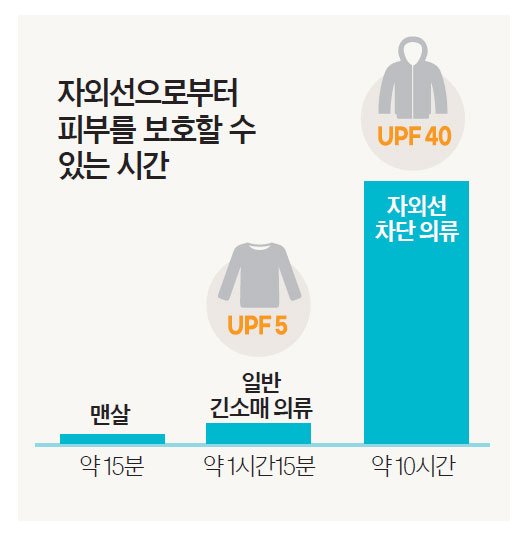소매가 긴 옷이라고 해서 모두 자외선을 차단해 주는 것은 아니다. 옷의 섬유 성분·구조에 따라 자외선 차단 지속시간·강도가 다르다. 선크림의 자외선 차단 지수(SPF)처럼 옷에도 자외선 차단 지수가 있다. 이를 ‘UPF(Ultraviolet Protection Factor)’로 표기한다. UPF 뒤의 숫자가 높을수록 자외선 A·B에 대한 차단 효과가 강하다. UPF는 자외선의 공격으로부터 맨살이 피부를 지켜주는 시간인 ‘15분’을 기준으로 삼는다. 예를 들어 UPF 40은 맨살이 15분간 자외선에 노출됐을 때보다 40배 더 긴 시간인 10시간(600분) 동안 자외선으로부터 피부를 보호한다는 의미다. 보통 면 소재의 티셔츠는 UPF 5~9, 청바지는 UPF 10 정도로 자외선 차단 효과가 미미하다.