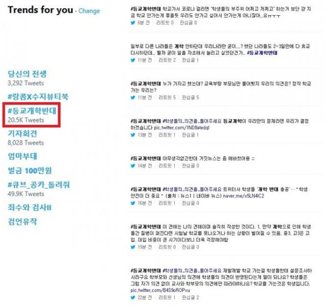 이날 트위터엔 ‘등교개학반대’, ‘학생들의_의견을_들어주세요’ 등의 해시태그가 담긴 글이 실시간으로 올라왔다. 오후 3시 30분 현재 ‘등교개학반대’ 해시태그가 담긴 글은 약 2만5000개에 달한다. 게시글 수는 지금도 빠르게 증가 중이다.