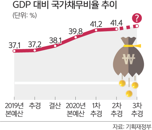 문제는 국가채무비율 상승 속도다. 2019년 본예산 당시 GDP 대비 국가채무비율은 37.1%였으나 올해 본예산에서는 39.8%로 상승했다. 이어 올해 1차 추경 때 41.2%, 2차 추경 때 41.4%로 올라갔다. 3차 추경이 30조원 규모로 이뤄지고 경제성장률이 0%를 기록할 경우 국가채무비율은 44.4%까지 치솟게 된다.