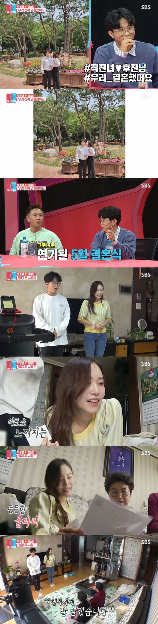 박성광과 이솔이 부부가 그려졌다. 2020년 5월1일을 기준으로 혼인신고를 하는 모습이었다. 원래 결혼식이었던 날, 계획대로 혼인신고를 진행했다는 것. 솔이는 "유부녀됐다, 오늘부터 다시 1일"이라면서 부부의 세계에 입성한 기념으로 인증샷을 남겼다.