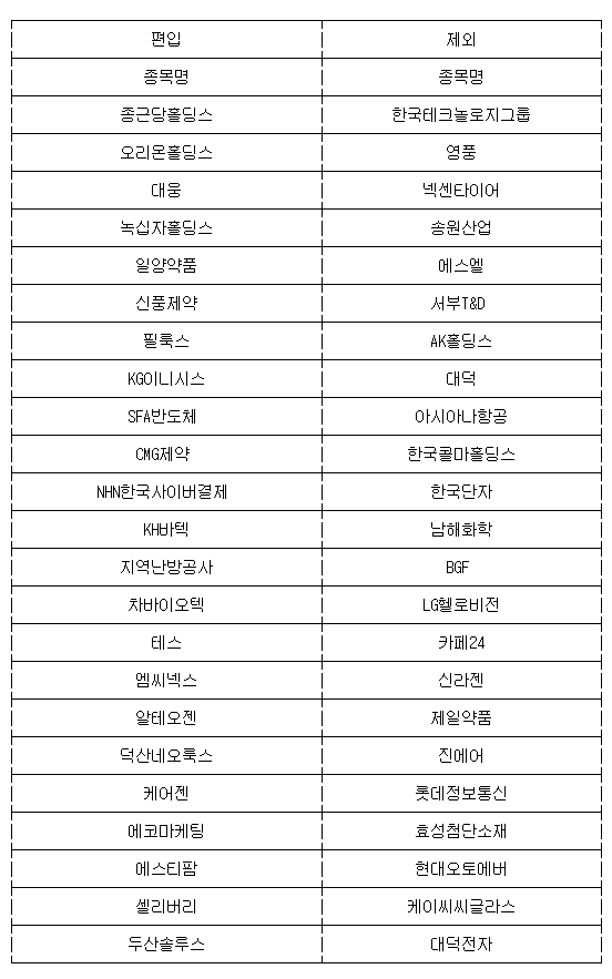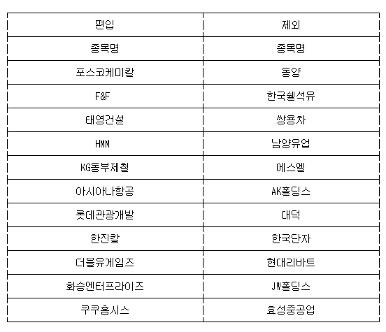 대신 동양, 한국쉘석유, 쌍용차, 남양유업, 에스엘, AK홀딩스, 대덕, 한국단자, 현대리바트, JW홀딩스, 효성중공업 등 11개 종목은 빠진다.