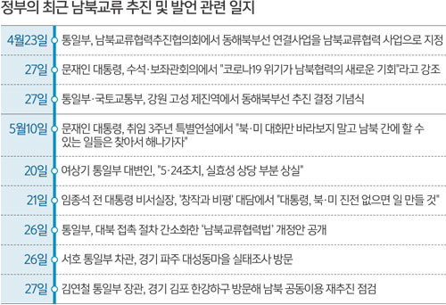 정부가 한동안 중단됐던 남북교류사업을 본격 재추진하기 위해 연일 군불을 때고 있다. 통일부 장차관이 잇달아 접경지역을 방문하는가 하면 대북 접촉 절차를 간소화하도록 법 개정도 추진하고 있다.