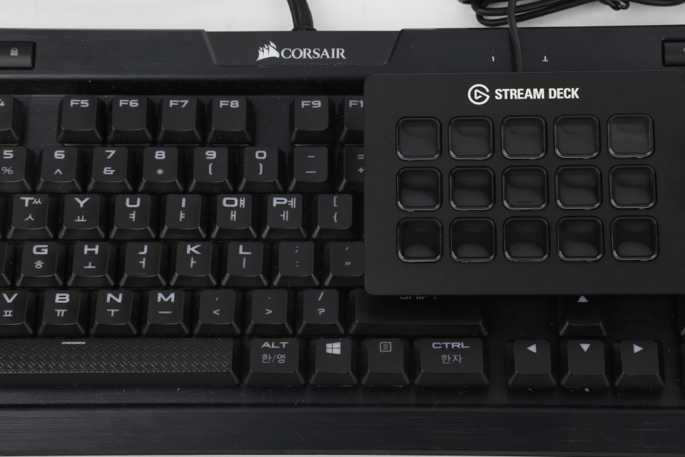 커세어 K70 RGB MK.2와 스트림 덱의 크기를 비교해봤다. 118x84mm의 아담한 사이즈다. |