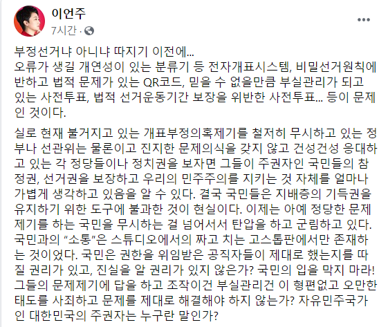 그는 “확실치 않으면 국민은 의혹도 제기할 수 없는 것이냐”며 “개표기 오류가 찍힌 동영상이 돌아다녀도, 투표용지가 전표처럼 붙어있어도, 투표용지가 빵 상자에 담겨 형편없이 부실 보관되고 있어도, 국민들은 아무 말도 하지 말아야 하는가? 누가 주권자란 말인가? 이 문제는 보수나 진보 같은 이념의 문제가 아닌 대한민국 민주주의의 문제이자 진실과 거짓의 문제”라고 일갈했다.