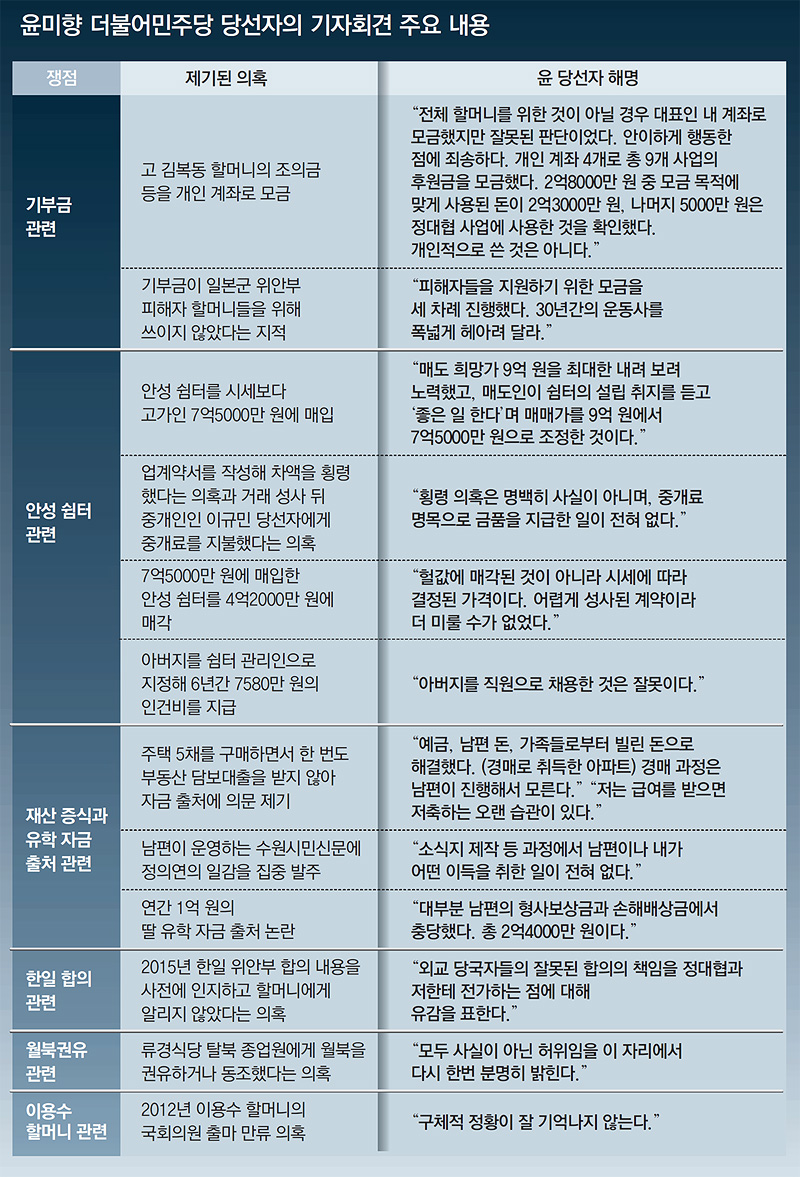 “국회의원 사퇴를 고려하지 않고 있다”는 18일 라디오 인터뷰 이후 11일 만인 29일 윤 당선자는 국회에서 기자회견을 갖고 그동안의 의혹을 해명했다. 윤 당선자는 “믿고 맡겨 주신 분들께 깊은 상처와 심려를 끼친 점을 진심으로 사과드린다”며 기자회견을 시작했다. 하지만 40여 분 동안의 기자회견 내내 “명백히 사실이 아니다”라며 8차례 이상 관련 의혹을 부인했다. 개인 계좌로 기부금을 모금한 것과 아버지에게 안성 쉼터 관리를 맡긴 것 등 두 가지 의혹만 사과했다.