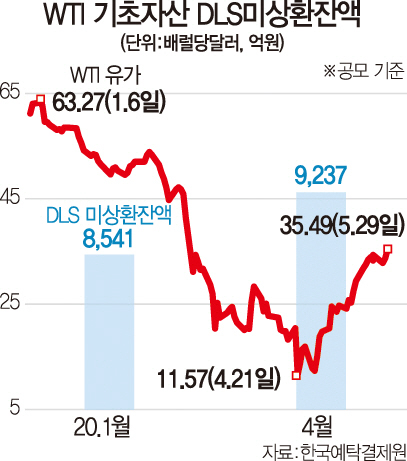 31일 한국예탁결제원과 증권가 등에 따르면 올해 4월 말 기준 WTI 가격을 토대로 한 공모형 DLS의 발행잔액은 약 9,237억원에 달했다. 여기에 사모로 발행된 원유 DLS까지 포함하면 대략 1조원을 넘어설 것이라는 게 업계의 추정이다. 국제 유가를 토대로 한 DLS는 대체로 우선 WTI를 기초자산으로 담고 추가로 브렌트유 가격 또는 해외 주가지수 등을 연계하는 방식으로 짜여진다.