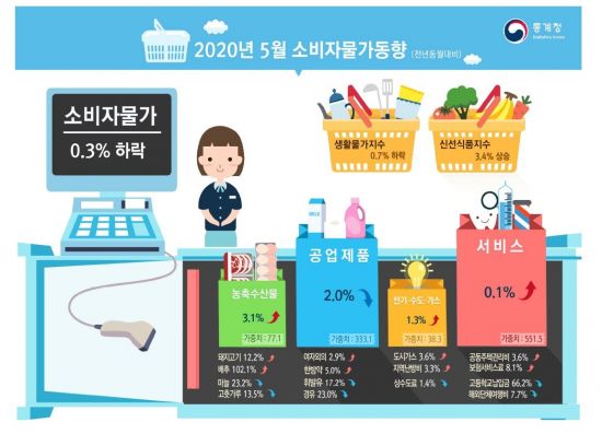 2일 통계청이 발표한 '5월 소비자물가동향'에 따르면 지난달 소비자 물가지수는 104.71(2015=100)로 전년 동기 대비 0.3% 하락했다. 전월 대비로는 0.2% 하락했다. 소비자물가가 마이너스를 기록한 것은 지난해 9월(-0.4%) 이후 처음이다.