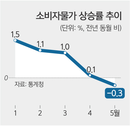 5월 0.3% 하락… 8개월 만에 다시 마이너스 / 국제유가 하락에 석유류 19%↓ / 공공서비스 물가도 2% 떨어져 / 집밥’ 늘며 농축수산물 3% 올라 / 배추 102·돼지고기 12%나 뛰어 / 정부 “일시적 저물가 현상일뿐”