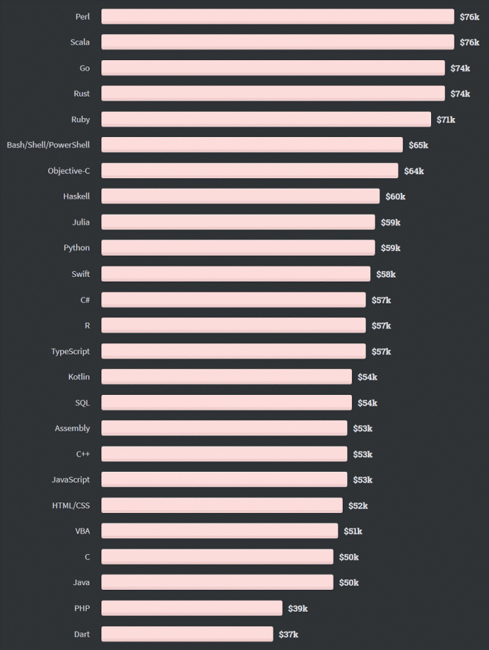 전 세계에서 프로그래머들이 가장 높은 연봉을 받는 언어는 펄(Perl), 스칼라(Scala), 고(Go)로 나타났다.