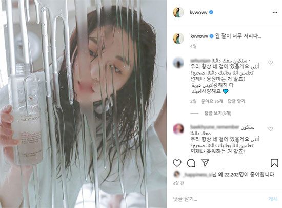 또한 지난 달 31일에는 "왼팔이 너무 저리다"는 글과 함께, 바디 워시를 부은 거울에 자신의 모습이 비친 사진을 인스타그램에 게재하기도 했다.