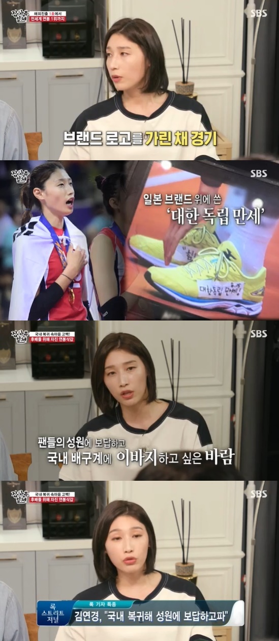 이날 김동현은 라이벌이 없는 상황에서도 최고의 기량을 갖추게 된 김연경을 칭찬하며 "또 한국인으로서의 자부심이 엄청 커서 일본 협찬사 신발을 신어야 하는데, 로고를 가리고 출전했다고 들었다"라고 밝혔다. 김연경은 "광복절날 대표팀 경기였다. '대한 독립 만세'라고 문구를 써서 문제가 있었다. 근데 어차피 하고 싶어서 한 거였기 때문에"라고 밝혔다. 보호대에도 태극기를 새겼다고.