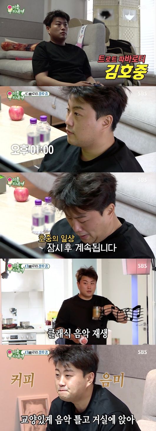 김호중은 아이스 커피를 즐기며 클래식 음악을 틀었다. "아으 시원해"라고 말한 김호중은 한동안 쇼파에 앉아 여유롭게 커피 마시는 시간을 보냈다. 뿐만 아니라 김호중은 TV 속 음식을 판매하는 홈쇼핑 채널을 보며 행복한 웃음을 지어 보는 이들로부터 공감대를 형성했다.