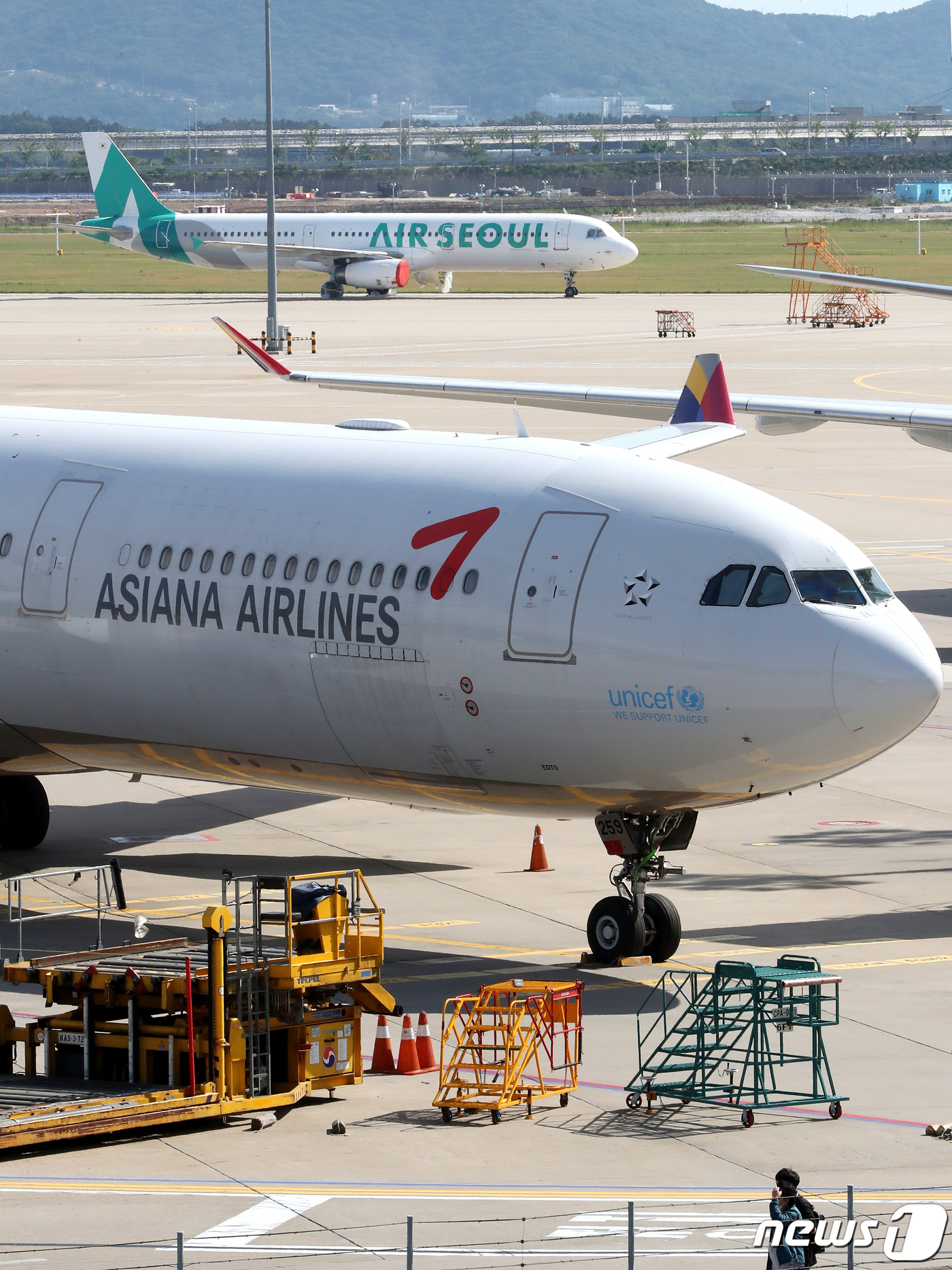 (인천공항=뉴스1) 정진욱 기자 = 아시아나항공은 15일 서울 강서구 본사에서 임시 주총을 열고 발행주식 총수와 전환사채 발행 한도를 늘리는 정관 개정안을 출석 주주 전원 찬성으로 의결했다.이에 아시아나항공 발행 주식 총수는 8억 주에서 13억 주로 대폭 늘었다. 전환사채 발행 한도 역시 7천억 원에서 1조 6천억 원으로 늘어났다. 올해 1분기 기준 아시아나항공의 부채비율은 6,280%로 전 분기의 4.5배에 달하며, 부채는 전 분기 12조 5,951억 원에서 13조 2,041억 원으로 크게 늘어났다. 15일 인천국제공항 계류장에 아시아나항공 여객기가 멈춰서 있다.2020.6.15/뉴스1