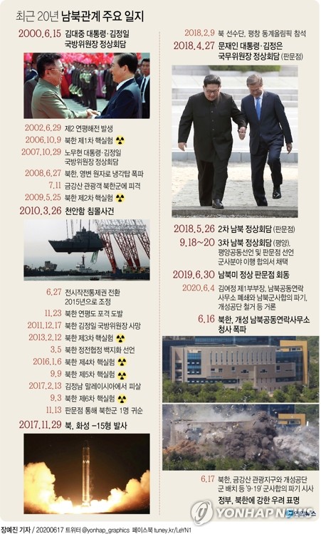 (서울=연합뉴스) 정아란 박수윤 기자 = 북한이 개성 남북공동연락사무소 무단 폭파 다음 날인 17일 동시다발로 남측을 비난하는 담화를 쏟아내고 군 총참모부가 9·19남북군사합의 파기를 시사하면서 남북관계가 2000년 이전으로 후퇴하고 있다.