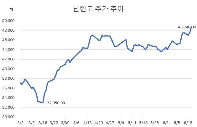 닌텐도 주가는 일본 동경거래소에서 이달 들어 17일까지 11.9% 상승했다. 지난 3월 중순 저점 이후 주가는 47.9% 뛰었다.
