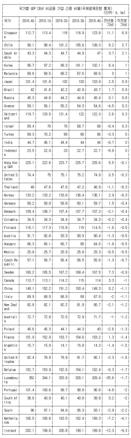 한국의 GDP 대비 비금융기업 신용 비율(102.1%)은 17위 수준으로, 16위 일본(103.9%)과 비슷했다.