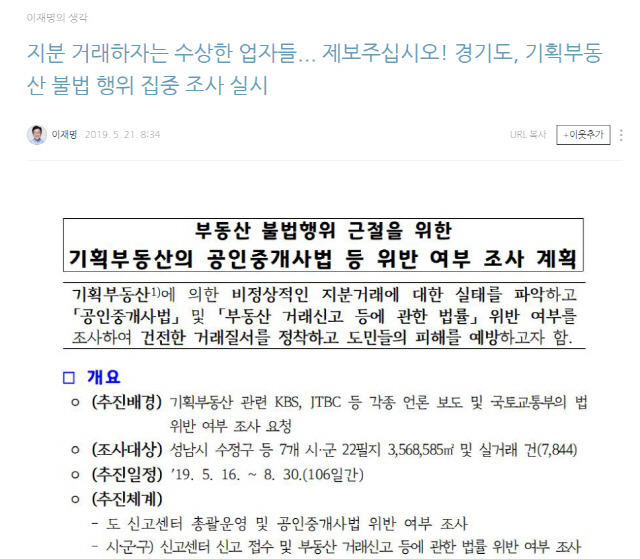 이 지사는 글에서 “마치 대단한 개발호재가 있는 듯한 허위 광고로 투자자를 유혹해 이익을 취하는 ‘기획부동산’이 기승”이라며 “조사 결과 올해만 성남, 의정부, 용인, 시흥, 평택, 파주, 연천 등에서 이런 거래가 집중 포착됐다”고 밝혔다.