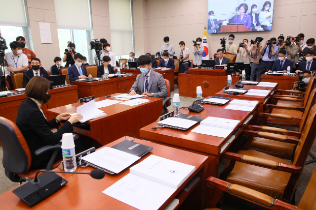 이날 법사위 회의는 지난 15일 민주당이 법사위 등 6개 상임위 구성을 단독으로 강행한 이후 네 번째로 열린 회의였다. 박병석 국회의장이 법사위원으로 강제 배정한 통합당 의원들은 이날 회의에도 불참했다.