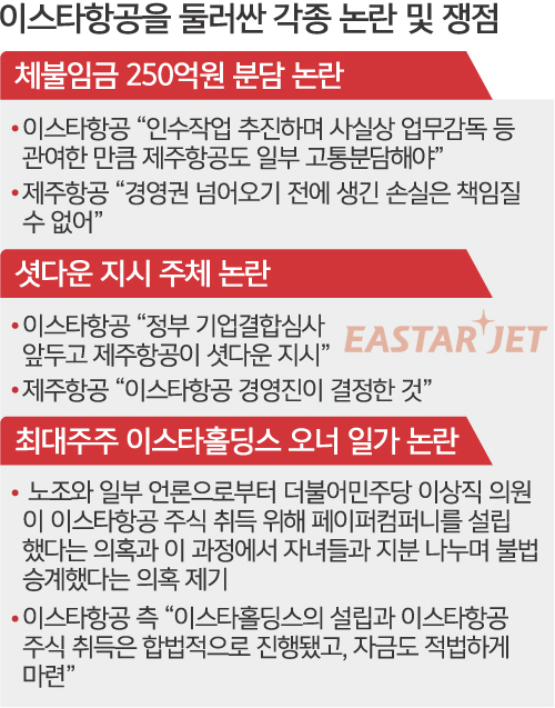 잇단 악재에 제주항공측 인수 무산 위기 / 직원들 체임 책임 놓고 양사 신경전 이어 / 창업주 이상직 의원 자녀 불법 승계 논란 / 노조 “李의원 페이퍼컴퍼니 통해 불법 자행” / 이스타선 “모든 일 합법·공개적 진행” 반박 / 제주항공, 최근 인수작업 절차 일시 중단