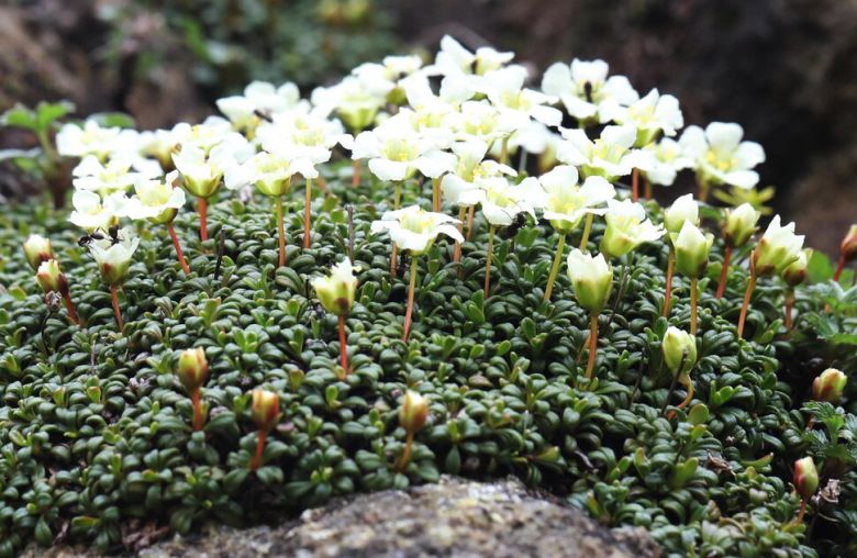 윗새오름 휴게소를 통과하고도 좀 더 오르자 정상 부근 수직 절벽이 눈에 들어왔다. 사람 한 명이 겨우 서 있을 수직 절벽 아래서 위를 바라보니, 방석처럼 깔린 잎 위로 돌매화나무 하얀 꽃 수백송이가 태양을 등진 북향 사면에 피어 있었다.