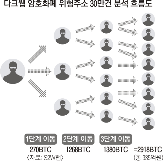 서울신문 탐사기획부와 S2W랩의 다크웹 범죄자금 분석 결과 국내 암호화폐 거래소가 처음 개설된 2013년 이후 현재까지 다크웹 범죄와 연관된 전자지갑 주소에서 국내 거래소로 흘러들어 온 암호화폐 규모는 2918BTC로 335억원(이날 기준) 이상인 것으로 집계됐다. 이는 범죄와 연계된 800만개의 블랙리스트 지갑 주소 가운데 현재 거래가 활발하게 발생한 30만개 주소의 자금 이동을 전수 분석한 결과다. 대부분 아동 성착취물 등 불법 촬영물 유통, 마약 거래, 카드 복제 등 범죄에 암호화폐를 악용한 경우였다.