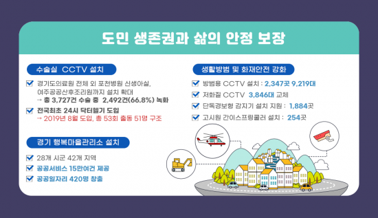 도가 중점적으로 추진한 정책 가운데 하나는 수술실 CCTV 설치였다. 수술실 내 폭언, 폭행 등 인권침해 행위와 의료사고 예방을 위해 2018년 10월 경기도의료원 안성병원에 첫 설치된 수술실 CCTV는 2019년 5월 경기도의료원 전체로 확산됐다. 올해는 경기의료원 포천병원 신생아실과 경기 여주공공산후조리원에도 CCTV가 설치됐다. 지난해 5월부터 올해 5월까지 총 3727건의 수술이 이뤄졌고 이 가운데 66.8%에 해당하는 2492건이 보호자 동의아래 녹화가 진행됐다.
