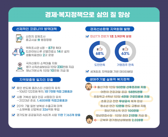 이 외에도 도는 용인 반도체 클러스터 산업단지 유치로 10년간 122조원 투자, 1만7000명 이상 직접 고용 효과를 얻게 됐다. 시흥 거북섬에 세계 최대 규모의 인공 서핑파크를 유치하고, 현재 공사가 진행 중이다. 2023년 조성이 마무리되면 1400여개의 직접 일자리가 창출되고 연간 200만명이 찾는 관광명소가 될 전망이다.