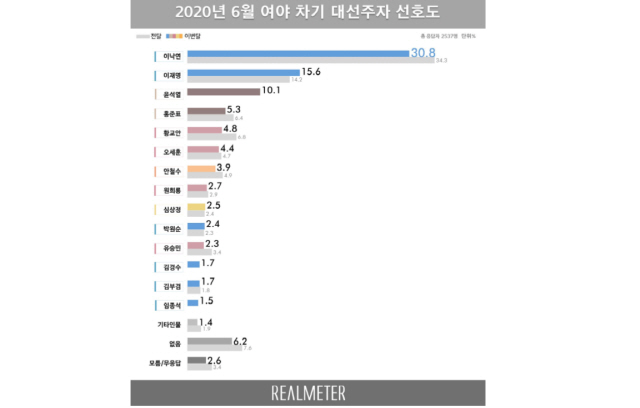 여론조사 전문기관인 리얼미터가 오마이뉴스의 의뢰로 지난 22일부터 26일까지 전국 18세 이상 성인 남녀 2,537명을 대상으로 조사한 결과 이낙연 민주당 의원은 전달 대비 3.5%포인트 하락한 30.8%를 기록했다. 그럼에도 불구하고 2위와의 격차는 여전히 15.2%포인트나 됐다. 이재명 경기도지사는 전월과 비교해 1.4%포인트 오른 15.6%로 집계됐다. 이 의원은 13개월 연속 1위를 이어갔고 이 지사는 처음으로 10%대 중반으로 올라섰다.