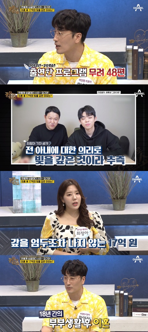 또 다른 기자는 “김구라는 빚 때문에 이혼한 게 아니다. 빚 10억원은 열심히 일해서 갚을 생각을 했는데, 이후 2년 동안 계속해서 빚이 발견돼 극심한 스트레스를 받으면서 공황장애까지 앓게 됐다”고 밝혔다. 이어 “김구라가 2012년부터 2015년까지 3년간 출연했던 프로그램이 48개인 것으로 알려졌다. 쉴 틈 없이 일한 것”이라고 밝혀 놀라움을 자아냈다.