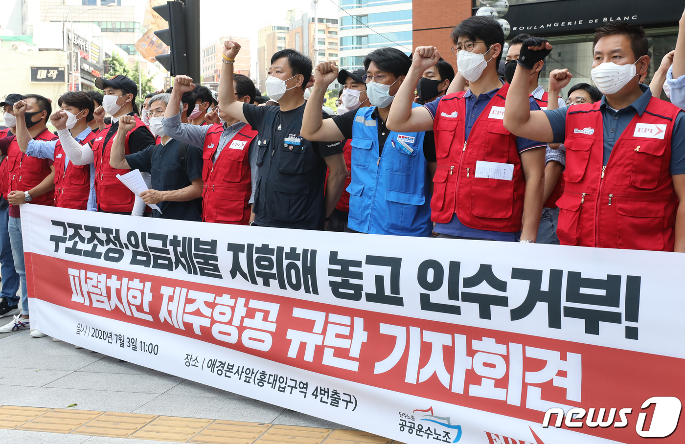 (서울=뉴스1) 송원영 기자 = 이스타항공 노동조합 회원들이 3일 서울 마포구 애경본사 앞에서 제주항공 규탄 기자회견을 하고 있다. 제주항공으로부터 10일이라는 시한부 선고를 받은 이스타항공 조종사 노동조합은 "제주항공이 구조조정으로 이스타항공 만신창이로 만들더니 인수를 거를 거부했다"며 "전면 셧다운으로 부채 누적 책임 등 이스타항공을 망쳤다"고 주장했다. 20207.3/뉴스1