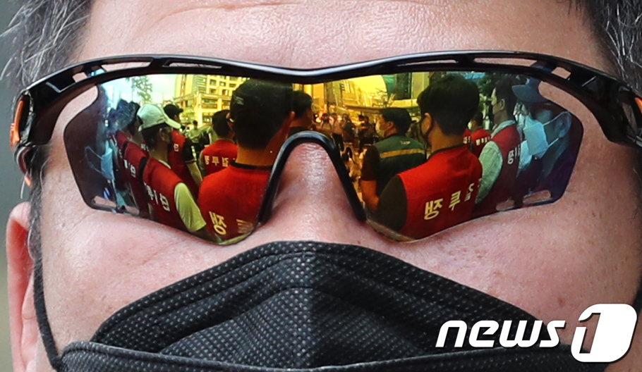 (서울=뉴스1) 송원영 기자 = 3일 서울 마포구 애경본사 앞에서 열린 제주항공 규탄 기자회견에서 이스타항공 노동조합 회원의 선글라스에 기자회견의 모습이 비치고 있다. 제주항공으로부터 10일이라는 시한부 선고를 받은 이스타항공 조종사 노동조합은 "제주항공이 구조조정으로 이스타항공 만신창이로 만들더니 인수를 거를 거부했다"며 "전면 셧다운으로 부채 누적 책임 등 이스타항공을 망쳤다"고 주장했다. 20207.3/뉴스1
