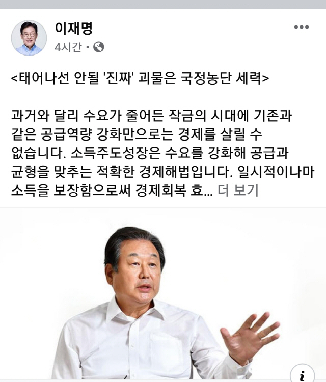 이 지사는 “과거와 달리 수요가 줄어든 작금의 시대에 기존과 같은 공급역량 강화만으로는 경제를 살릴 수 없다”며 “소득주도성장은 수요를 강화해 공급과 균형을 맞추는 적확한 경제해법이다. 일시적이나마 소득을 보장함으로써 경제회복 효과를 입증한 재난기본소득 정책만 보더라도 소득주도성장이 왜 필요한지 알 수 있다”고 주장했다.