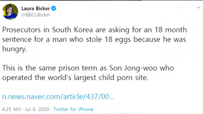 로라 비커 BBC 서울특파원은 자신의 트위터에 한국에서 달걀 18개를 훔친 40대 남성에게 검찰이 징역 1년6개월을 구형했다는 기사 링크를 첨부하고 "한국 검사들은 배가 고파서 달걀 18개를 훔친 남성에게 18개월 형을 요구한다. 이것은 세계 최대 아동 포르노 사이트를 운영한 손정우와 똑같은 형량"이라고 지적했습니다.
