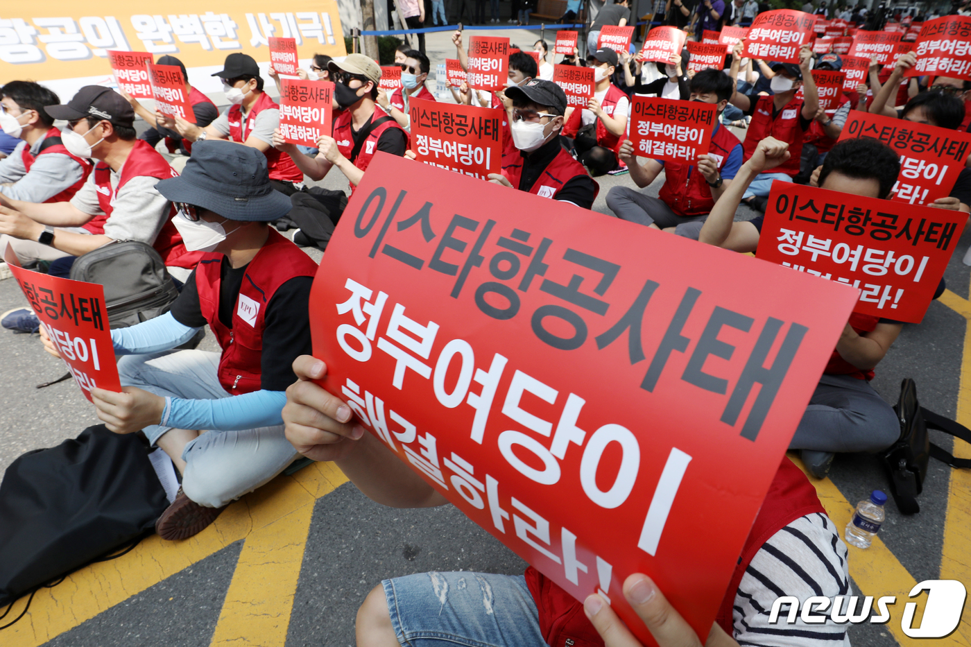 이날 참가자들은 "제주항공이 이스타항공 인수를 거부하고 파산으로 내몬다면 제주항공에 책임을 묻겠다"라면서 애경그룹(제주항공의 모기업)에 인수를 재촉하는 한편 정부에도 이번 M&A 상황과 관련한 책임을 촉구했다. 2020.7.8/뉴스1