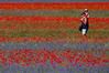 이탈리아 중부 움브리아주 소도시 카스텔루치오의 광활한 대지에 다양한 꽃들이 활짝 핀 가운데 6일 아이를 목마태운 한 시민이 꽃밭을 걷고 있다. 카스텔루치오=로이터 연합뉴스
