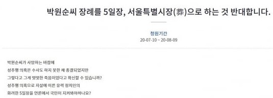 청와대 국민청원방에는 박 시장 장례를 서울특별시장으로 하는 걸 반대한단 청원이 10일 올라오기도 했다. 청원자는 "떳떳한 죽음이었다고 확실할 수 있느냐"며 "화려한 5일장을 국민이 지켜봐야 하느냐"고 비판했다. 해당 청원은 1만여명 넘는 지지를 받았다.
