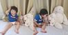 사진 속 하영은 파란색 티셔츠를 입고 토끼 인형 옆에 앉아 머리를 만지고 있다. 다른 사진에서는 토끼 인형에 뽀뽀하는 모습이 담겼다.