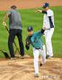 2회말 계속되는 우천에 잠실구장 관계자들이 마운드를 보수하고 있다. NC 구창모가 연습투구를 하고 있다.