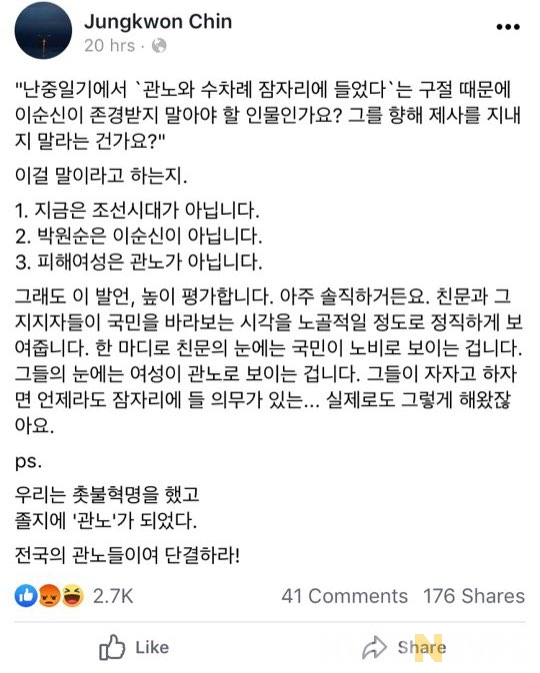 전날 진중권 전 동양대 교수도 자신의 페이스북에 “이걸 말이라고 하냐. 지금은 조선시대가 아니다. 박원순은 이순신이 아니다. 피해여성은 관노가 아니다”라며 강하게 비판했다.