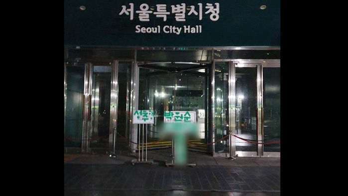 고 박원순 서울시장에게 성추행을 당했다고 주장하는 전직 비서 측의 기자회견 하루 만인 오늘(14일) 새벽 서울시청 정문에 박 시장을 비난하는 청테이프 게시물이 붙었습니다. 시청이 조사에 나섰습니다.