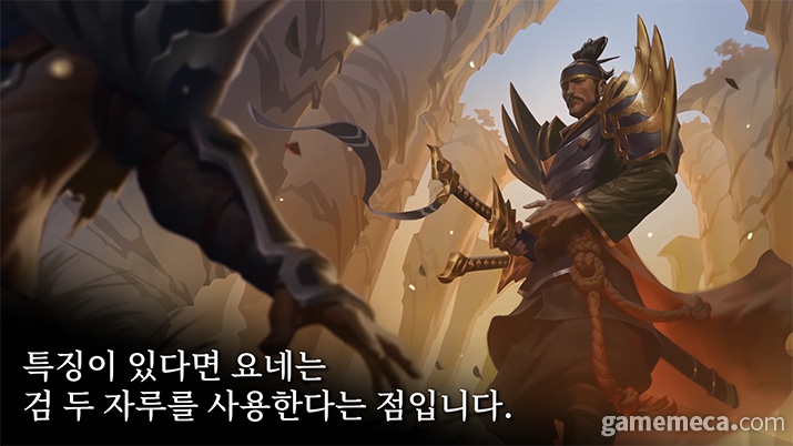 요네는 야스오의 형으로, 검 두 자루를 사용하는 무사 캐릭터입니다. 요네에 대한 추측은 예전부터 있었는데요, 이번 유출이미지 속에 쌍검을 든 캐릭터가 등장해 많은 사람들이 요네의 등장을 기정사실화 하고 있습니다. 이제껏 나온 이미지 유출본과 라이엇게임즈 공식 자료 속 숨겨진 요소들을 바탕으로 요네의 등장을 재구성해보았습니다.