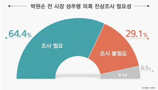 고(故) 박원순 서울시장의 성추행 사건에 대한 진상조사가 필요하다는 답변이 64%로 필요하지 않다는 의견(29%)보다 두 배 이상 높은 것으로 나타났다. 진보와 보수, 중도층은 박 전 시장의 유고로 ‘공소권 없음’으로 수사 종결된 사건에 대한 진상조사가 필요하다는 여론이고 20대와 30대 남녀는 이 비율이 70%대를 넘어섰다.